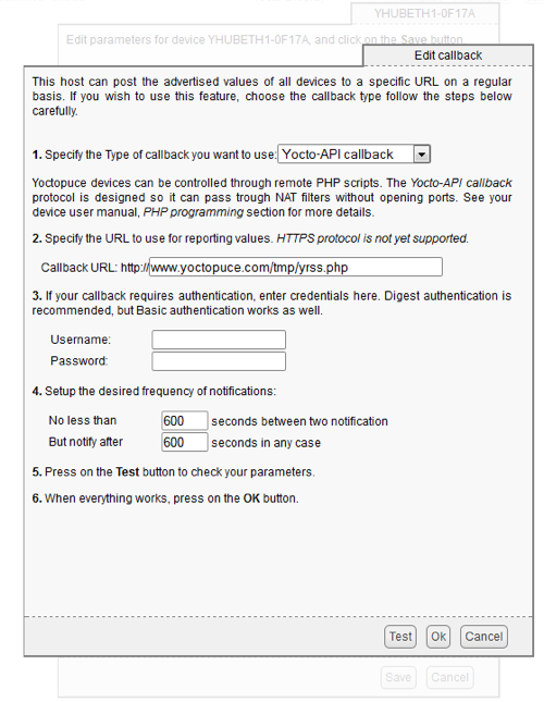 When you have access to the YoctoHub-Ethernet, you have to enter the URL of your PHP callback and to setup the update delay to 600 seconds between each call. When these parameters are saved, the Yocto-MaxiDisplay starts to display the content of your RSS Feed.