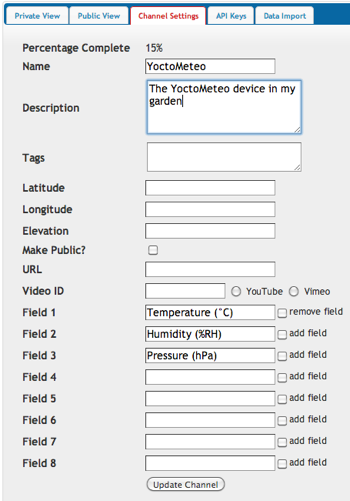 Unlike Cosm which was officially a Beta program, ThingSpeak intends to stay a free service. The price to pay for this is a limit on data upload rate: no more than one update every 15 seconds. This might be a problem for some applications such as our network multimeter, but we can understand this.