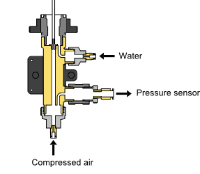 The water/air separation in the bottle is ensured by a small tube which goes very high in the bottle. Compressed air goes in through this tube, and we know that water cannot go out from there.