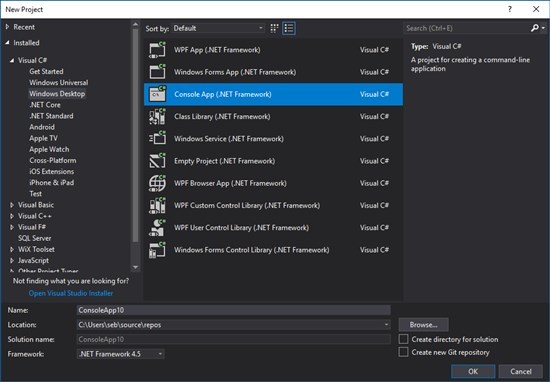 You must start by creating a new project of type "Console App (.NET Framework)" in Visual Studio.