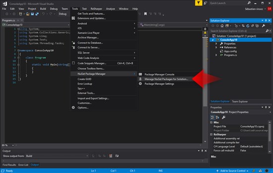 Then, you must access to the "NuGet package manager". You can do so by using the menu ("Tools"->"NuGet Package Manage"->"Manage NuGet Package for Solutions...") or with a right click on the project by selecting "Manage NuGet Package...".