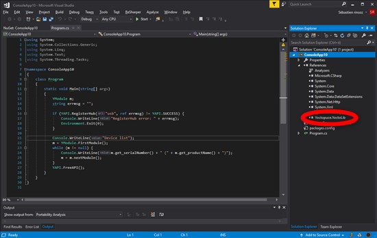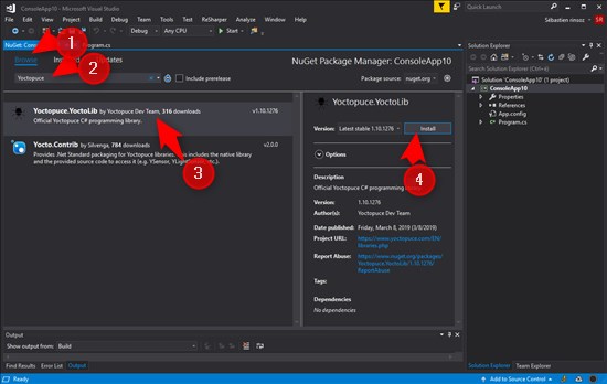 To show how to use the NuGet package, we are going to write a short command line program which lists the Yoctopuce modules connected to the USB ports.