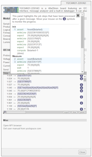 An important advantage of Yoctopuce serial interfaces, compared with RS-232, RS-485 or TTL serial interfaces found elsewhere, is the ability to define stand-alone jobs in the module, for example to query a sensor. This week, we're releasing new firmware for these modules, which facilitates debugging of these scripts, by enabling their progress to be traced in parallel with message exchanges.