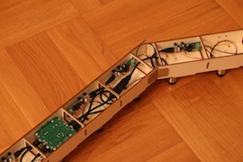 The 10 telemeters are connected to 5 Yocto-PWM-Rx controlled through the network thanks to a YoctoHub-Ethernet powered by Power-over-Ethernet. To transform the measures into sounds, we programmed a few lines of code linking the Yoctopuce library, able to read the sensor over the network, with the fluidsynth library, able to play notes.