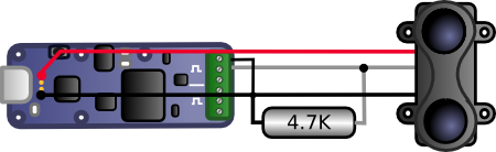 The LIDAR-Lite requires a 5V power source: we connect the red wire to the 5V source, and the black wire at the opposite end to the ground. Now if you link the 3rd wire towards ground going through a resistance, the sensor will perform continuous measurements and advertise the measures using square pulses on that wire. The duration of the pulses in milliseconds corresponds to the distance in meters.