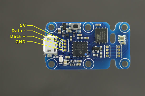 USB cables are undeniably very practical. However, their innocent air hides a large defect: they take up a huge amount of space. This is particularly obvious when you work with Yoctopuce modules of which the average size is 50x20mm, so more or less the size of a USB A plug. Therefore all Yoctopuce modules provide, behind their USB socket, pads allowing you to interconnect them in a more compact manner. These pads are made of four holes distant of 1.27mm, corresponding to, in the order: +5V, Data-, Data+, GND, so respectively the Red, White, Green, and Black wires of a USB cable. The square shaped pad corresponds to GND.