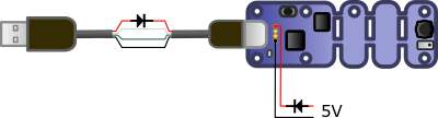 Yoctopuce modules are powered through their USB port. This raises a small issue when you want to power a module with a battery, but also want to connect it from time to time to a computer without having to disconnect the power supply. There are several ways to solve the issue.