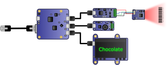 The Yocto-Serial is coupled to a YoctoHub-Ethernet. To have an appropriate user interface, we added a Yocto-MaxiDisplay-G and a Yocto-Buzzer. We even wondered if we should add a cash register as well. The main advantage of the YoctoHub-Ethernet is that it enables you to power the scanner by PoE: so we need only one cable to connect the scanner.