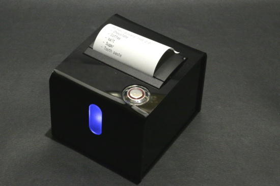 We print the shopping list with the printer we built last week. It is based on a YoctoHub-Wireless-SR, which means that it can wake up at specific dates and times, so we can configure it to wake up when we usually go shopping and the server can make it flash if there is something to be printed. Thus, if you place it conspicuously, not too far from the front door for example, you can hope to remember to print the list before you go shopping.