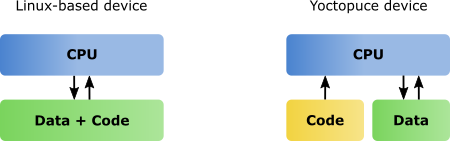 A device running on a standard OS is more vulnerable to buffer overflows than a YoctoHub, which is based on a Harvard architecture with code separate from data