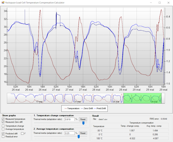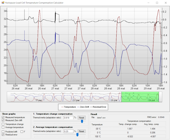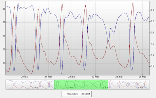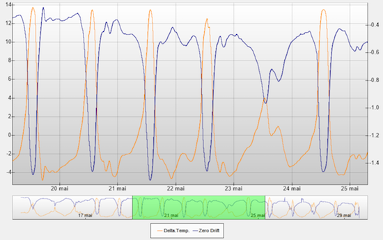 We notice that in the present case, the offset drift could be divided by a factor of about 5 to 10. It's a typical improvement of the results that this method enables you to obtain on different load cells. In many cases, the difference is therefore significant. For example, by looking in details at the graph, we observe a small leap of 0.2g on the measure on May 27, probably caused by a bug which must have landed on the scale pan and stayed there for a few hours. While this leap was mostly hidden by important thermal variations on the original data, it is now clearly visible on the data improved by software compensation.