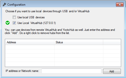 Let's assume that we use a Yocto-Buzzer to make a beep each time an alarm is triggered. We are going to configure the application so that it uses the VirtualHub as illustrated above. And we use the ybuzzer.exe executable to make the beep, taking care to indicate that it too must use the VirtualHub (-r 127.0.0.1).