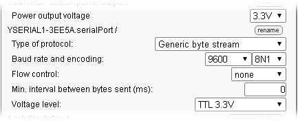 To work with the PIR sensor, the Yocto-Serial must be properly configured. The easiest way is to use the VirtualHub. The first thing you need to do is to configure the port speed, that is to 9600bauds, 8N1. Then you must enable the power supply of the module in 3.3V.