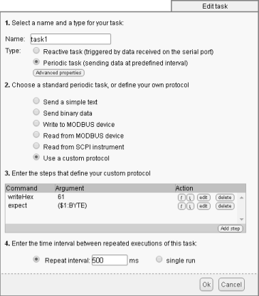 Therefore, we configured the Yocto-Serial to work in binary mode (generic byte stream) and we created a task that, every 500 ms, sends the 0x61 byte (a) to the sensor, then reads a byte as answer and maps it on genericSensor1. Thus, depending on the ZEPIR0BAS02MODG answer, the values 78 (N), 85 (U), 89 (Y) are mapped on genericSensor1.