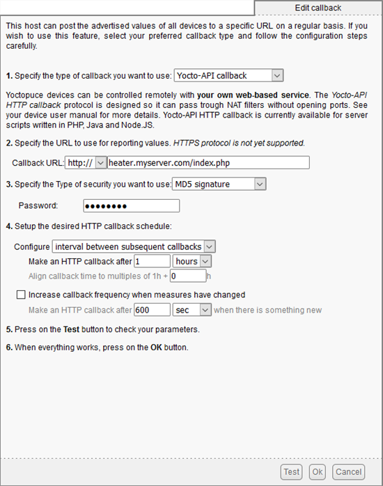 You must select a callback of type Yocto-API callback and enter the URL of our PHP script. For the security parameters, use the MD5 Signature option and enter the same password as used in the PHP script.