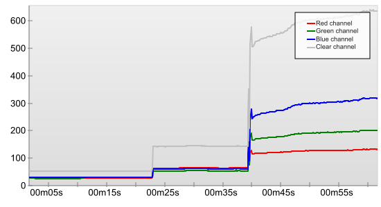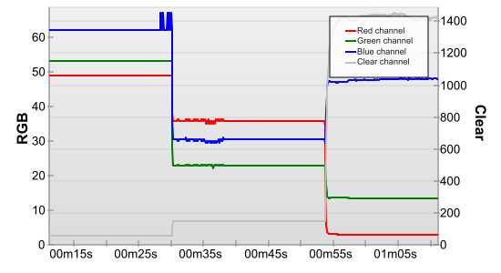 But this illustrates the issue with this type of sensor: it's difficult to exactly map the values of the sensor with a set color. However, you can try to take advantage of the fact that the sensor has a channel which measures white light and try to normalize the RGB values by comparing them to the white channel. The library provided by Adafruit does just that. The code divides the value of each channel by the value of the white light, limits the results between 0 and 1.0, puts everything to the power of 2.5 to compensate the lack of linearity of the sensor, and multiplies everything by 255. We can modify our job so that it does the same thing: