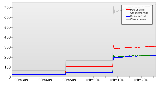 We placed the sensor about 4 cm above a piece of paper with large squares of solid colors and we tried three distinct levels of lighting: ambient light, lighting with the embedded white led, and lighting with a powerful light.