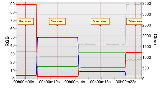 We are not convinced so far. This type of sensor would probably work well to classify a set of predefined colors under a well controlled lighting, but it seems difficult to use it to recognize and reproduce with accuracy any color observed under an arbitrary lighting. You now understand why we are reticent to create a Yoctopuce module on its own right. This being said, we don't give up the idea: there may be color sensors easier to exploit. If you nevertheless want to use the TCS34725 with a Yocto-I2C, you can download the two jobs described in this post.