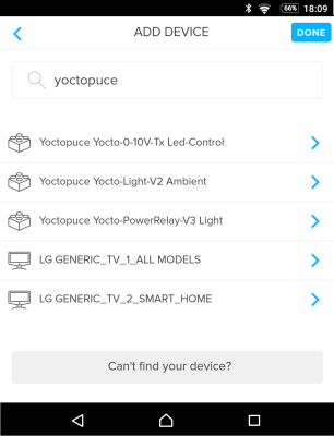 As soon as the driver has discovered the first modules, you can add them to the remote control by adding a new device in the NEEO application. Simply look for "Yoctopuce" when the application asks you for the model name to be added, and all the discovered modules are proposed. As the driver is purely local, it doesn't use NEEO's servers and you can therefore install it even if NEEO's server are unreachable.