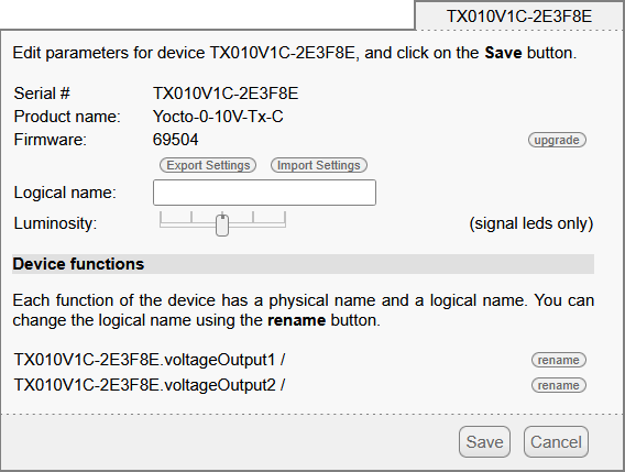 The two main functions provided by the Yocto-0-10V-Tx-C module are "voltageOutput1" and "voltageOutput2" . Simply click on the rename button next to a function to assign it a new logical name.