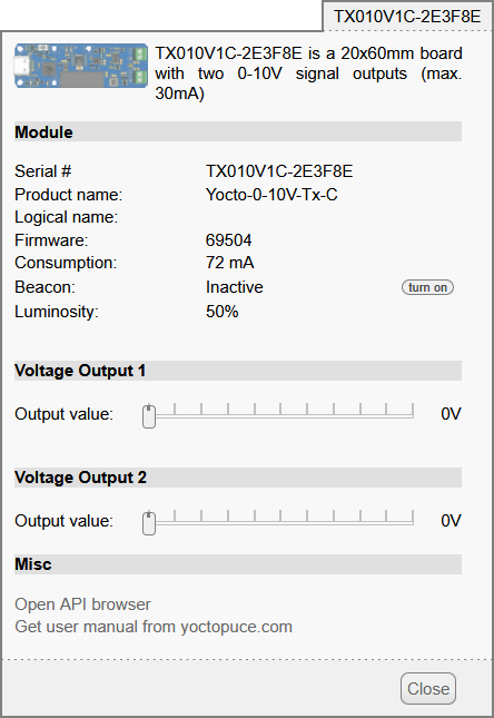 The first item to check is that your module is working well: click on the serial number corresponding to your module. This displays a window summarizing the properties of your Yocto-0-10V-Tx-C.