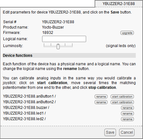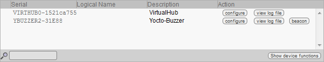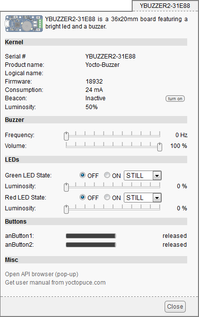 The first item to check is that your module is working well: click on the serial number corresponding to your module. This displays a window summarizing the properties of your Yocto-Buzzer.
