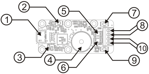 | 1: | Micro-B USB socket | 6: | Led 2 (red) |