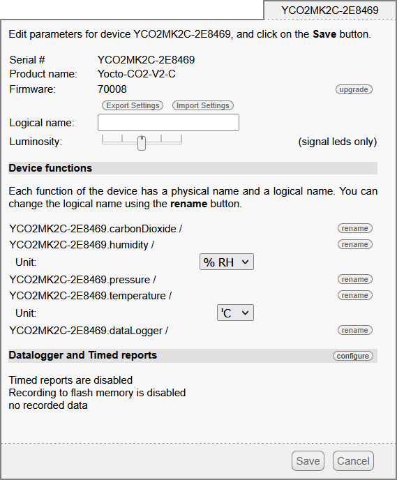 The functions provided by the Yocto-CO2-V2-C module are "CarbonDioxide", "Temperature", "Humidity" and "Pressure". Simply click on the corresponding "rename" button to assign it a new logical name.