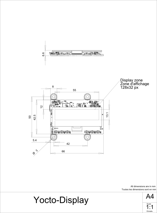 The Yocto-Display is a 66x58mm electronic module allowing you to drive a 128 x 32px monochrome OLED screen, as well as 6 channels which can measure the state of switches, push buttons, or even potentiometers. This screen enables you to easily display some easily readable pieces of information from a machine which does not usually have a monitor.