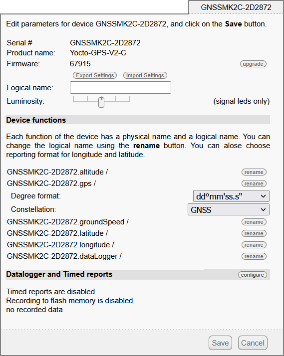 You can assign logical names to several functions of the Yocto-GPS-V2-C by clicking on the corresponding "rename" button.