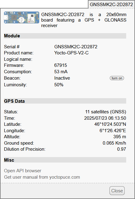 The first item to check is that your module is working well: click on the serial number corresponding to your module. This displays a window summarizing the properties of your Yocto-GPS-V2-C.