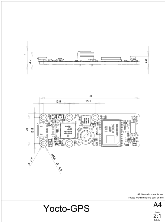 In order to mount the Yocto-GPS module, you can put small screws in the 2.5mm assembly holes, with a screw head no larger than 4.5mm. The best way is to use threaded spacers, which you can then mount wherever you want. You can find more details on this topic in the chapter about assembly and connections.