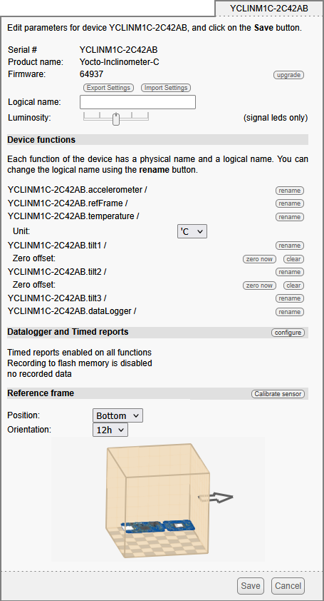 The Yocto-Inclinometer-C module has 7 functions. Simply click on the corresponding "rename" buttons to assign them new logical names.