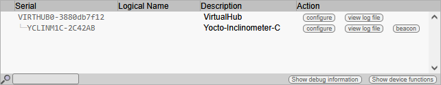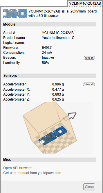 The first item to check is that your module is working well: click on the serial number corresponding to your module. This displays a window summarizing the properties of your Yocto-Inclinometer-C.