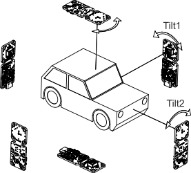 Note that the care used in the explanation above is nothing more than a mean of explaining the orientations. If you intend to use the Yocto-Inclinometer-C to determine the orientation of a care, remember that this sensor is based on accelerometers. Therefore, you will only get a precise value when the vehicle is subject to no other force than gravity, which means either at full stop, or driving straight at constant speed. Moreover, remember that this device does not include a compass, so it cannot determine its horizontal orientation.