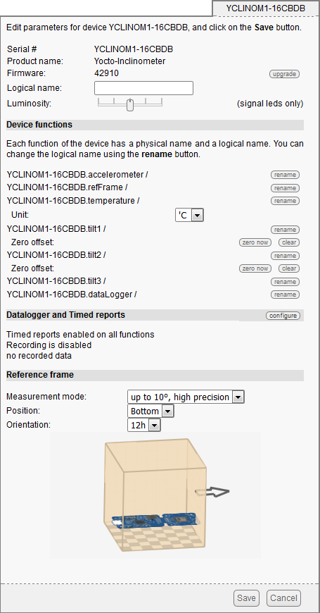 The Yocto-Inclinometer module has 7 functions. Simply click on the corresponding "rename" buttons to assign them new logical names.