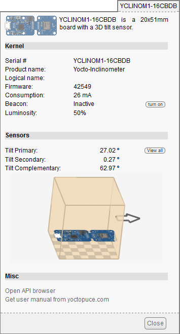 The first item to check is that your module is working well: click on the serial number corresponding to your module. This displays a window summarizing the properties of your Yocto-Inclinometer.