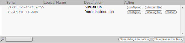 You can then physically localize each of the displayed modules by clicking on the beacon button. This puts the Yocto-led of the corresponding module in Yocto-beacon mode. It starts flashing, which allows you to easily localize it. The second effect is to display a little blue circle on the screen. You obtain the same behavior when pressing the Yocto-button of the module.