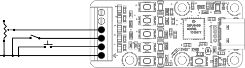 The Yocto-Knob-C module has five inputs with a common earth, which means that each switch, push button, or potentiometer, must be connected both to its corresponding input and to the earth. You can use any potentiometer value between 1KΩ and 200 KΩ.