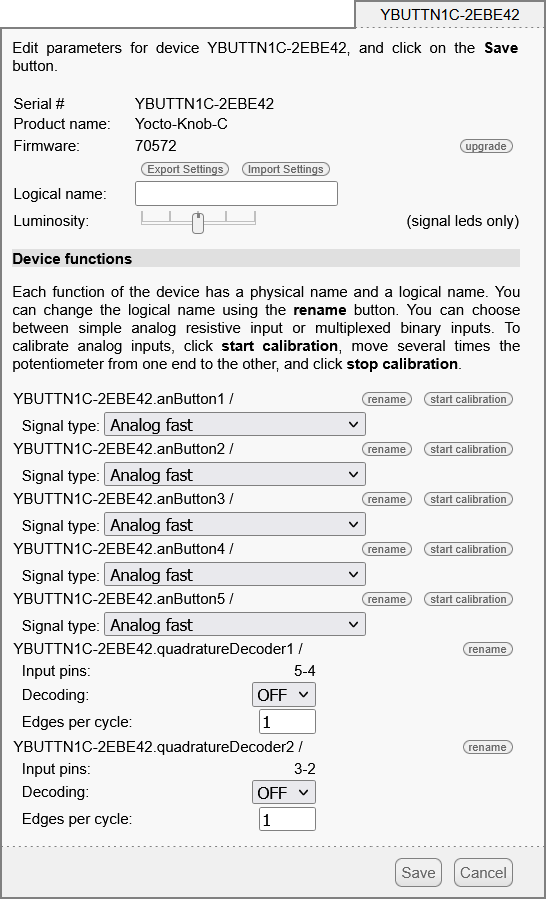 The only function provided by the Yocto-Knob-C module is the anButton function, of which there are five instances: anButton1 to anButton5. To rename one of them, simply click the rename button and enter a new name in the window that opens.