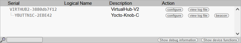 You can then physically localize each of the displayed modules by clicking on the beacon button. This puts the Yocto-led of the corresponding module in Yocto-beacon mode. It starts flashing, which allows you to easily localize it. The second effect is to display a little blue circle on the screen. You obtain the same behavior when pressing the Yocto-button of the module.