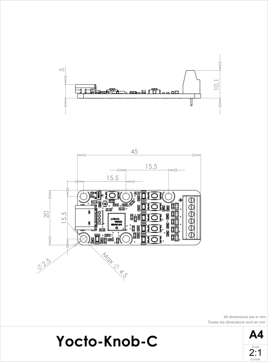 In order to mount the Yocto-Knob-C module, you can put small screws in the 2.5mm assembly holes, with a screw head no larger than 4.5mm. The best way is to use threaded spacers, which you can then mount wherever you want. You can find more details on this topic in the chapter about assembly and connections.