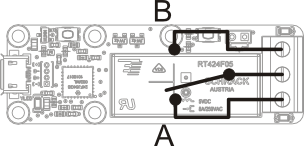 The relay embedded in the Yocto-LatchedRelay module is a commutator, which means that it can commute its input current onto one of two outputs. This is why the terminal has three poles: the input is at the center, and the outputs are on the outside. When the module is powered off, output A is active.