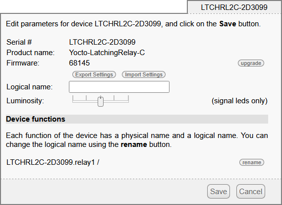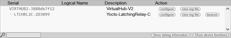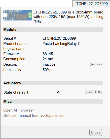 The first item to check is that your module is working well: click on the serial number corresponding to your module. This displays a window summarizing the properties of your Yocto-LatchingRelay-C.