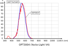 The Yocto-Light-V4 uses a OPT3004 sensor from Texas instruments. this sensor string points are: a great sensitivity (0.01 lux), a reasonably high sampling frequency (10Hz) and a response curve even closer to the human eye response than the version 3.
