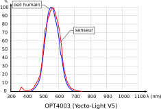 The ADPS-9301 in the Yocto-Light-V2 works differently: it uses two distinct detectors, sensitive to different spectrums. Their responses can be combined to compute an estimated human eye perception. These detectors are more sensitive and more reactive than the SFH5712. They provide a faster measure rate and can take measurements in lower light.