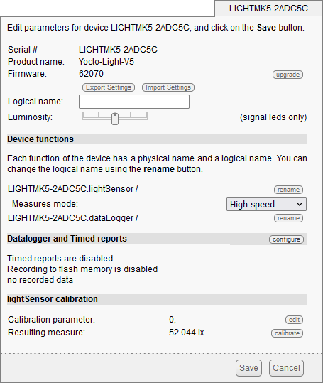 The only function provided by the Yocto-Light-V5 module is the "lightSensor" function. Simply click on the corresponding "rename" button to assign it a new logical name.