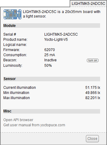 The first item to check is that your module is working well: click on the serial number corresponding to your module. This displays a window summarizing the properties of your Yocto-Light-V5.