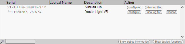 Go to the Yoctopuce web site and download the Virtual Hub software8. It is available for Windows, Linux, and macOS. Normally, VirtualHub serves as an abstraction layer for languages which cannot access the hardware layers of your computer. However, it also offers a succinct interface to configure your modules and to test their basic functions. You access this interface with a simple web browser9. Start VirtualHub in a command line, open your preferred web browser and enter the URL http://127.0.0.1:4444. The list of the Yoctopuce modules connected to your computer is displayed.