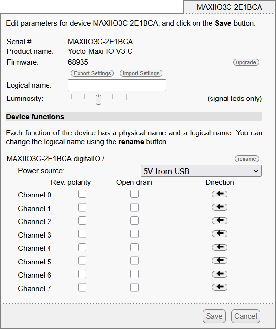 The configuration is saved in the flash memory of the Yocto-Maxi-IO-V3-C. This means that it resists shutdown. The Yocto-Maxi-IO-V3-C is delivered with its eight channels configured in simple input mode.